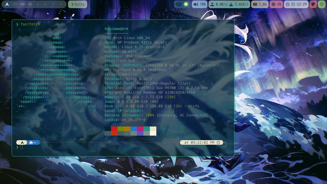 Weekly #24~27 发表于 2025-07-04 分类于 Essays | 随笔 , Weeklies | 周报 阅读次数: 本文字数: 64 阅读时长 ≈ 1 分钟 0x0. 玛卡巴卡 无疑地,最近是颓废的。 却更多的是累。 以及折腾。 0x1. 阿卡哇卡 把一坨台 inf 年之前的 HP ProBook 4311s 翻出来 Van ♂ 了玩。 装了个 Arch 上去。 成果如下。 Wallpaper 图源为 PixivArtwork 132131646。